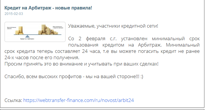Со 2 февраля с.г. установлен минимальный срок пользования кредитом на Арбитраж. Минимальный срок кредита теперь составляет 24 часа, т.е вы можете погасить кредит не ранее 24-х часов после его получения.