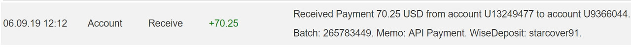 WiseDeposit - образец надежности и стабильности в постоянно меняющемся мире высокодоходных проектов. Тут все просто: вложил-подождал-получил, часть выплаты пустил на реинвест и так по кругу. В рамках построения закольцовки сделал небольшой вклад на 8,57$. К нему приобщил промокод, усилив вклад на 25%. К адаптации готов на 256%, поэтому очередную выплату 49$ вывел на кошелек. Скорость вывода приличная - деньги дошли за 4 часа.