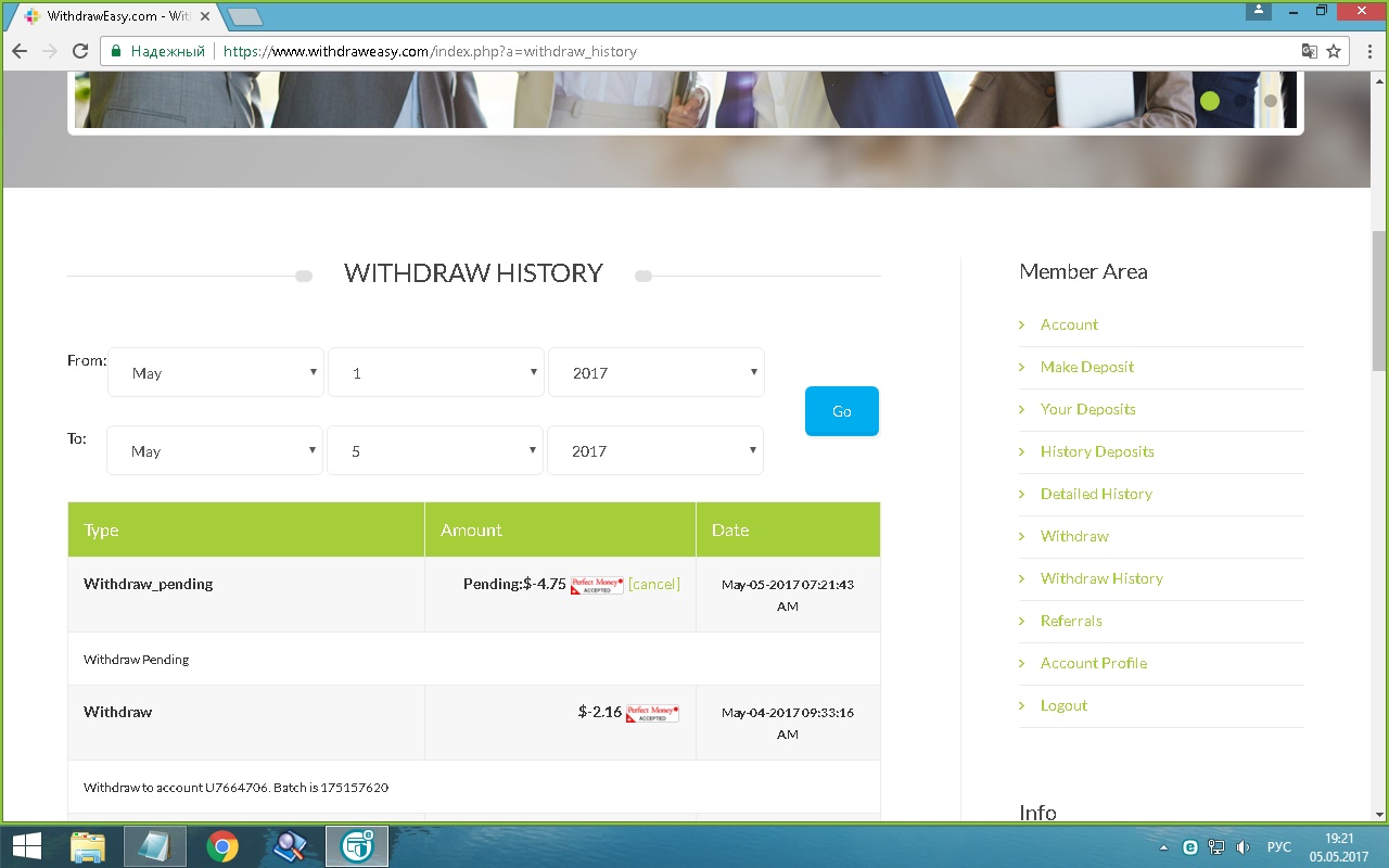 The amount of 0.95 USD has been deposited to your Perfect Money account. Accounts: U13062063->U8хххххх. Memo: API Payment. Withdrawal to Ustas from withdraweasy.com.. Date: 11:24 05.05.17. Batch: 175242400.