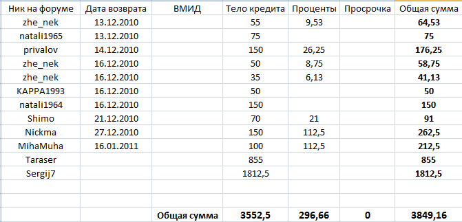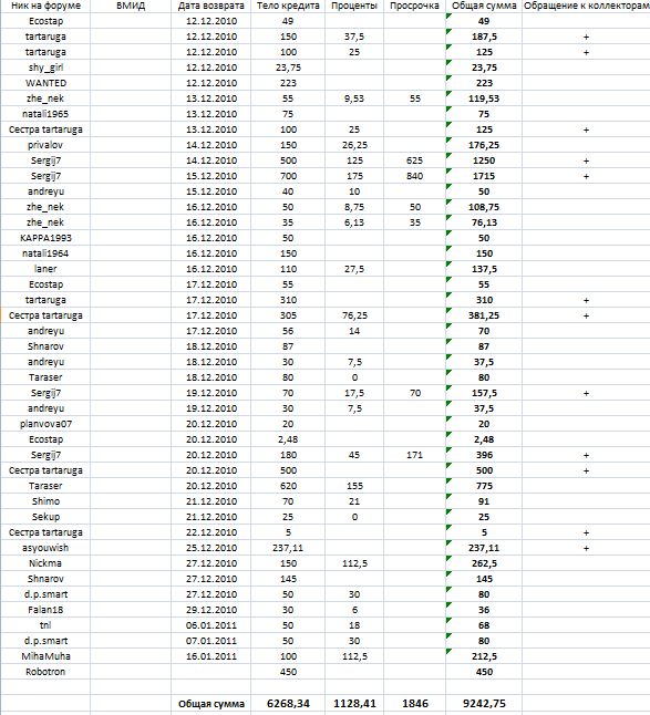 Таблица пополняется и исправляется по ходу отписок кредиторов.Из-за праздничных дней,банк не успел перевести средства,таблица как я понимаю составлена,но там на первом месте должна стоять tartaruga,расчёты начнуться с понедельника,вторника,соголасно Вашей таблицы,ничего не могу поделать,банк не успел до 7 перевести средства.