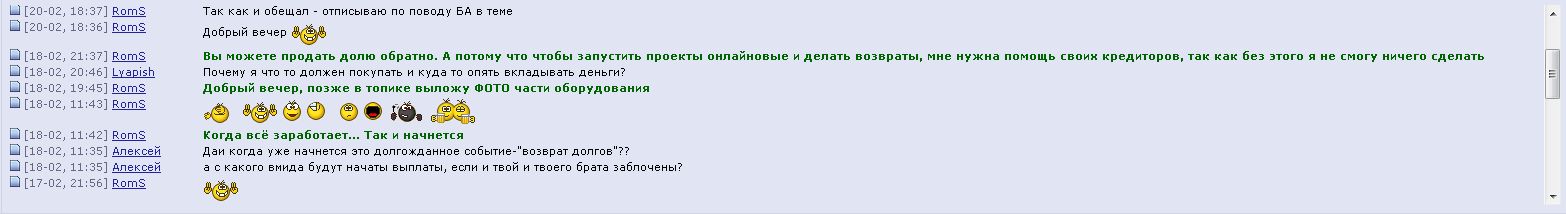 Здравствуйте, что бы начать дальнейшую работу своих (бывших) проектов и заняться возвратом долгов, я отдал свой БА новому управу: Подробности описываю на нашем форуме (иным образом проекты запустить не получится) А всех кредиторов прошу лучше в этом помочь а не обливать грязью, я наверно один такой из Ваших должников который хоть что-нибуть делает и заинтересован в возвратах. Уже много людей присоединились к помощи