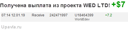 The amount of 4 USD has been deposited to your account. Accounts: U18464399->. Memo: API Payment. Withdraw.. Date: 06:35 11.01.19. Batch: 242365360.