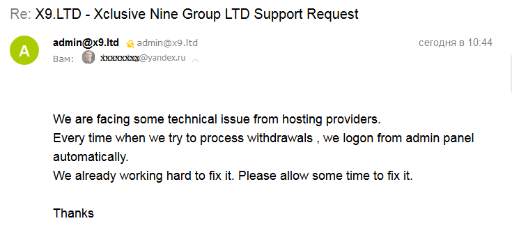 Мы рады сообщить, что минимальный депозит был уменьшен для наших часовых планов. 3% до 5% Почасовая оплата за 49 часов Минимальный депозит теперь $ 500 10% до 15% Почасовой за 24 часа Минимальный депозит сейчас $ 1500 Не упустите шанс заработать хорошо с этими почасовыми планами. Наши методы оплаты: Биткойн, Perfect Money, Litecoin, ETH, Bitcoin Cash, Payeer, ADVCash и многое другое. Оставайтесь с нами и ожидайте новых обновлений в ближайшее время! STEVE WHITFIELD Исполнительный директор С наилучшими пожеланиями X9.LTD - Xclusive Nine Group LTD