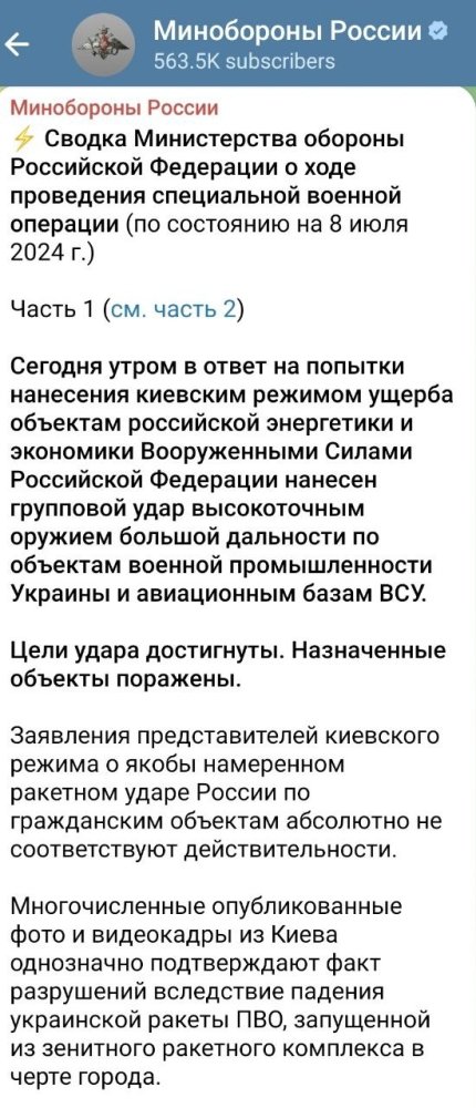 В течение суток Вооруженными Силами Российской Федерации нанесен групповой удар высокоточным оружием по американским комплексам реактивной системы залпового огня HIMARS, подготовленным для нанесения ударов по территории Крыма, а также месту проведения служебного совещания командного состава ВСУ. Цели удара достигнуты.