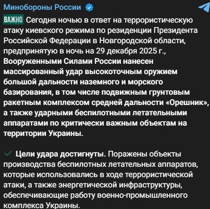Россияне заявили, что "в ответ" на так называемую "атаку по резиденции" российского диктатора был совершен теракт против украинского гражданского населения: запуск ракеты с комплекса Орешник и атака ударными беспилотниками.