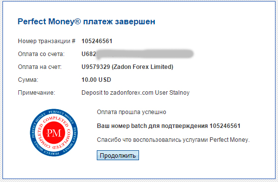 The amount of 102 USD has been deposited to your Perfect Money account. Accounts: U9579329->U559****. Memo: API Payment. Withdraw from zadonforex.com.. Date: 06:19 14.10.15. Batch: 105246429.