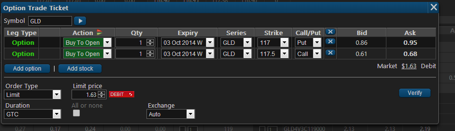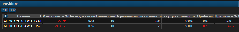 Спустя 20минут-час после открытия мы берем стрэддл на квартальных опционах GLD на страйке 117.0. Ордер ставим дебетовый лимит на весь стрэддл.