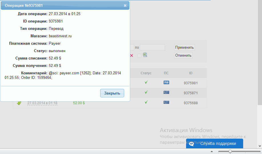 01.04.2014 02:06 $50.00 ******* карта Visa